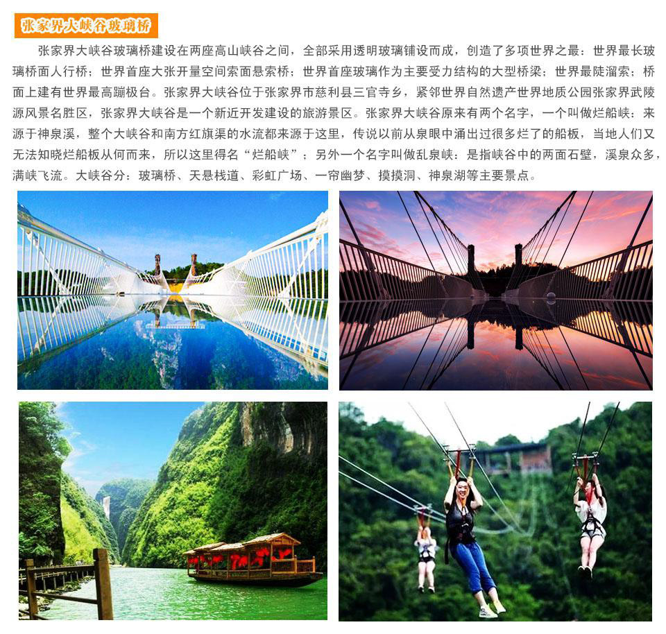 在張家界汽車站乘坐武陵源的線路車(50分鐘左右)下車轉乘大峽谷的線路車(30分鐘左右)游覽張家界地貌的極品景區(qū)之一、集山水洞峽于一身的國家AAAA級旅游景區(qū)——[張家界大峽谷](大峽谷景區(qū)+玻璃橋B線)張家界大峽谷峽谷間是一條清幽的小溪,沿溪邊是用木板搭建的游道, 張家界大峽谷峽谷內不僅有傳統(tǒng)的秀美自然風光,還云集有三朝數代的歷史人文景觀;體驗世界第一長的高山峽谷斜拉玻璃橋奇觀、它目前是世界最長、最高的全透明玻璃橋,橋面全部采用透明玻璃鋪設,橋中心有全球最高的蹦極臺,整個工程無鋼筋支架,是一種全玻璃結構的橋梁。此玻璃橋還是世界首座斜拉式高山峽谷玻璃橋,首次使用新型復合材料建造橋梁等多項世界之最。游覽晚后可返回市區(qū)。(或武陵源汽車站)[乘坐汽車(3-4小時)前往]](鳳凰古城)觀看鳳凰古城夜景,沿途觀賞湘西風光,感受少數民族風情,鳳凰古城系國家歷史文化名城,曾被新西蘭著名作家路易艾黎稱贊為中國最美麗的小城晚漫步沱江體驗江邊酒吧迷幻浪漫與迷醉偶遇、沱江河燈許愿成真……