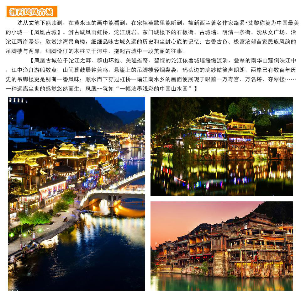 [鳳凰古城位于沱江之畔、群山環(huán)抱、關隘雄奇、碧綠的沱江依著城墻緩緩流淌,疊翠的南華山麓倒映江中,江中漁舟游船數點,山間暮鼓晨鐘兼鳴,懸崖上的吊腳樓輕煙裊裊,碼頭邊的浣紗姑笑聲朗朗,兩岸已有數百年歷史的吊腳樓更是別有一番風味;順水而下穿過虹橋一幅江南水鄉(xiāng)的畫面便展現于眼前—萬壽宮、萬名塔、奪翠樓……一種遠離塵世的感覺悠然而生;鳳凰——猶如“一幅濃墨淺彩的中國山水畫”,當你徜徉古城用條石砌成的巖板街時,兩邊的古建筑各抱地勢,鱗次櫛比,亭臺樓閣重重疊疊,如巨龍飛舞,似鰲魚展翅,細雨聲中,仿佛傳來敬香人的牛皮釘鞋敲擊街面,發(fā)出“叮?!钡捻懧?,使人產生隔世之感。街道兩邊,有許多屠鋪、染坊、制作銀器首飾的作坊;各種土特產的店鋪,工藝美術店。還有小吃部和酒店,狗肉湯鍋香味,包谷燒的醇香使人唾涎],游覽晚后可至吉首或張家界汽車/火車站返程,結束愉快的旅行!