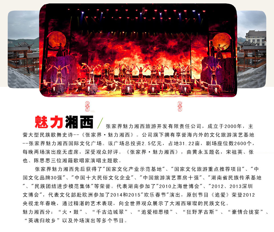 19:30-21:00 晚可欣賞觀看《星光大道》合作伙伴、央視春晚《追愛》節(jié)目原型——[魅力湘西]大型民俗歌舞秀最具人氣,探尋屈原筆下詭異的楚風遺俗,神秘的湘西趕尸,品鑒中國入座率排行第一,品牌無與倫比堪稱民族世界之最的視覺盛宴或自由活動酒店休息。