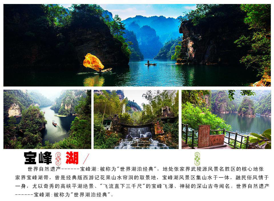 前往“空中圣湖”[寶峰湖景區(qū)](門票96元,可代訂優(yōu)惠門票):蕩舟——“人間瑤池”聽土家阿哥阿妹山歌傳情、兩岸碧水悠悠、鷺鷥捕魚,寶峰湖集山水于一體,融民俗風情于一身,尤以奇秀的高峽平湖絕景、“飛流直下三千尺”的寶峰飛瀑、神秘的深山古寺聞名,觀賞寶峰飛瀑、仙女照鏡、石門迎賓、孔雀開屏、金蟾含月、神龜出水等栩栩如生的景點[或游覽地下國寶—黃龍洞景區(qū)(門票100元,可代訂優(yōu)惠門票):黃龍洞享有“世界溶洞全能冠軍”之美譽,2005年被評選為“中國最美的旅游溶洞”,洞中燈火闌珊、石筍林立,猶如一株株古木錯節(jié)盤根、洞中有洞、洞中有河、無奇不有,真乃名副其實的“地下魔宮”,洞中還有投保一億元的石筍定海神針、響水河、龍王聚會廳、天仙水、天柱街等著名景點。(以上寶峰湖及黃龍洞可根據客人游覽興趣二選一)],游玩后可入住市區(qū)酒店。